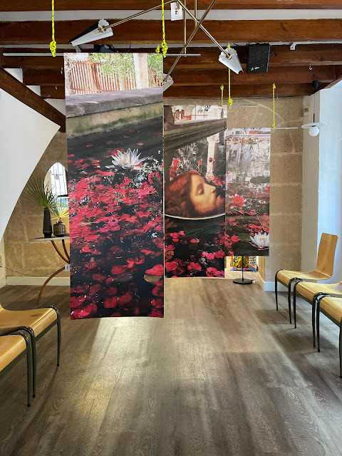 Yolanda Trigo a modus ‘wilderiano’ presenta como elemento principal una obra en collage fotográfico sobre tres lonas a modo cortinaje (velos) que ocupan el espacio central de la sala. El espectador observará fraccionada la composición para después transitarla (danzar a través de ella), preside como representación central la cabeza un San Juan Bautista (obra pictórica de Bernardino Luini, c. 1520-30, óleo sobre tabla) en una bandeja con una sigilosa mano de Salomé debajo ofreciéndola como exvoto (bésale y pídele como hizo ella) flotando sobre un estanque (del Palacio Episcopal de Palma) con nenúfares (ninfas) como parte de un ‘hortus conclusus’. Salomé está presente en la sala, pero no se la ve pero se intuye, forma parte de todos los elementos iconográficos y simbólicos presentes, incluso puede y se sugiere que ella sea parte interior del propio espectador que asiste a su encuentro. Una Salomé de Wilde aparentemente seductora, ansiosa y deseosa, pero a la vez despechada por un San Juan al que nunca podrá conseguir, he aquí el eterno drama entre el Eros (deseo, amor) y el Thanatos (la muerte).
